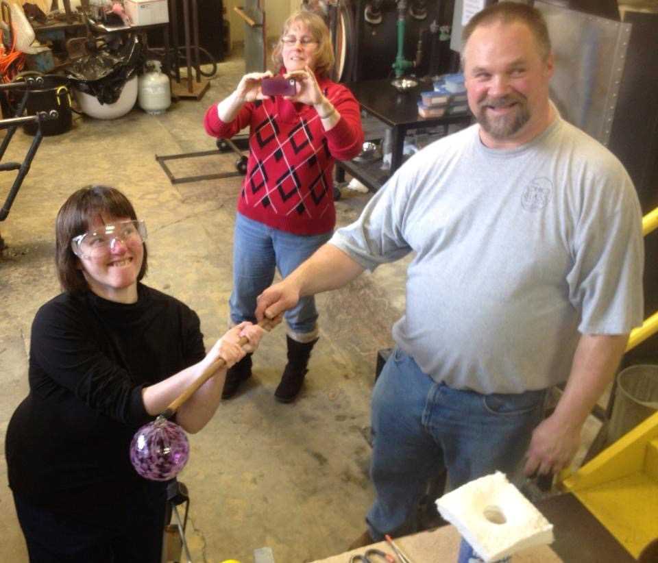 My step-daughter Becky Knicely shows off the ornament she created at the Ohio Glass Museum and Glass Blowing Studio as her mom (and my wife) Sandy Drenten takes a picture. (Credit: Ken Drenten)
