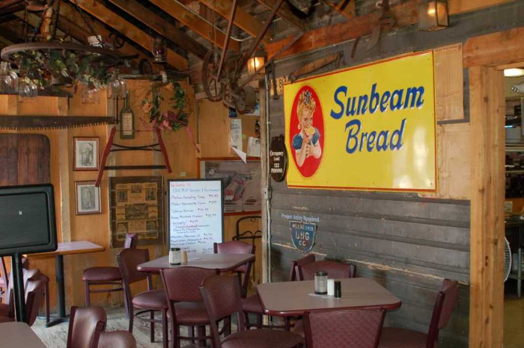 An old photo of the mill posted on an interior wall, probably from the early 20th century, shows lettering painted on the outside reading “NICKEL PLATE FLOUR/FEED STORE, BALED HAY STRAW, CUSTOM GRINDING.”