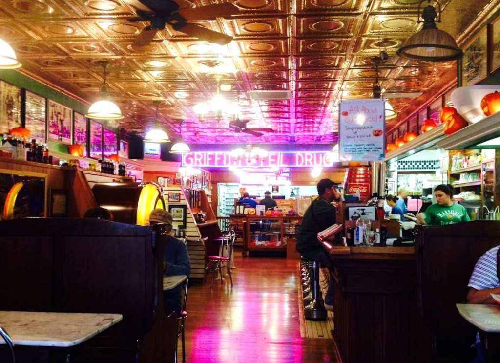 The store retains much of its original ambience with its tin ceiling, historic photographs and memorabilia that line the walls, and touches like a jukebox and a vintage Coca-Cola soda dispenser. Customers can find souvenir items, cards and gifts at Griffith & Feil as well.