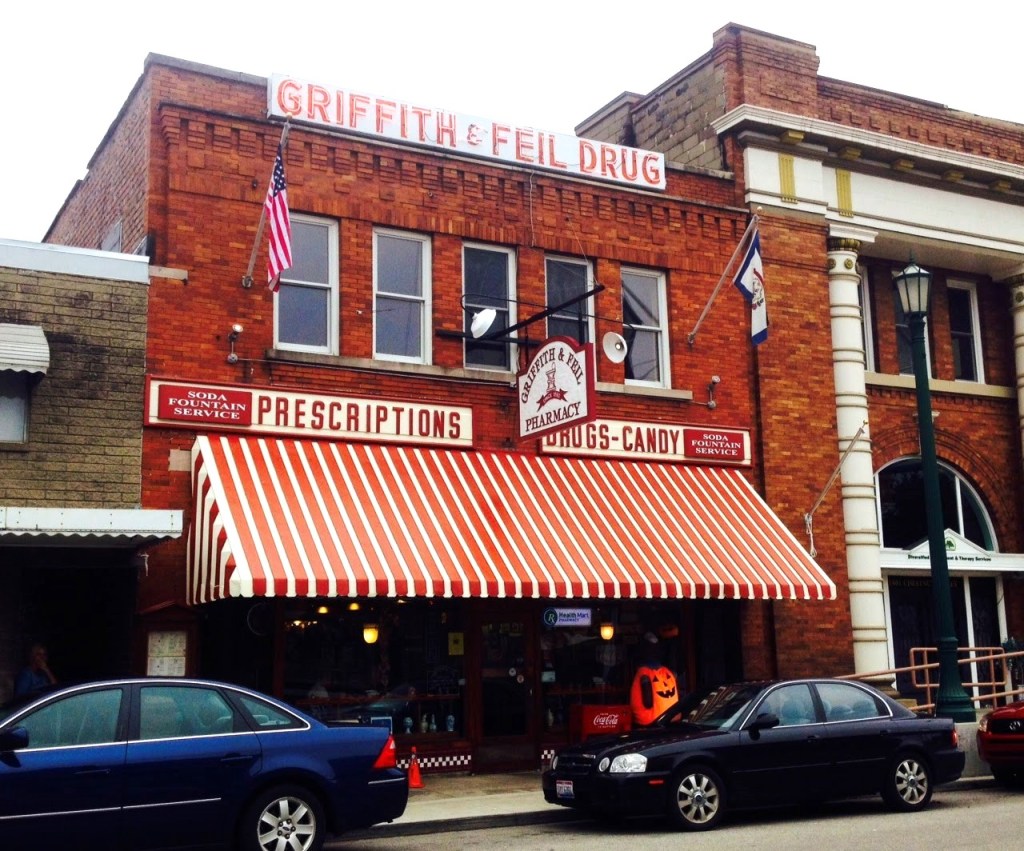 Griffith & Feil Drug is located at 1405 Chestnut St., Kenova, W.Va. (304) 453-5227. When we visited several years ago, a mid-20th century motel was located across the street, along with an actual telephone booth.