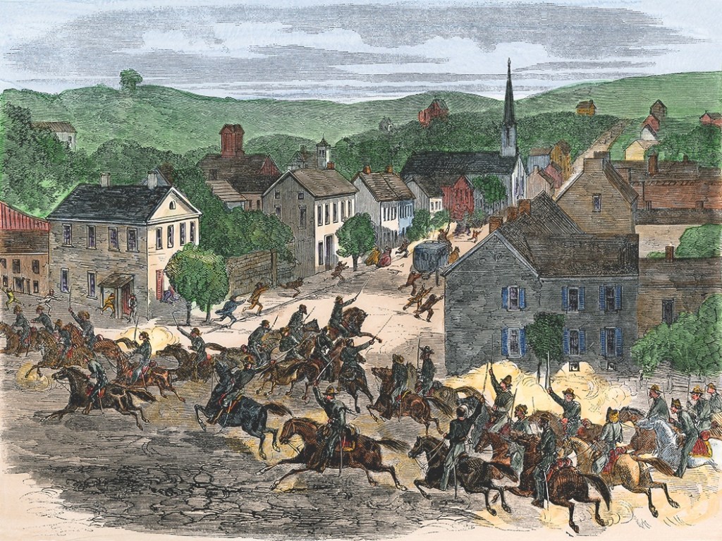 When Union troops arrived a few hours later, Confederate sentries fired a warning shot and the raiders quickly began mounting up to elude capture. Both sides fired at the other in a chaotic scene, with civilians scrambling for safety.