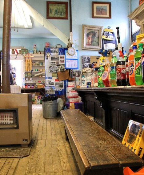 The original white-painted shelves are still in the store, displaying new items for sale as well as antiques. Old calendars, vintage soda bottle openers, old photographs and advertisements are still posted on the store’s walls. The store’s original wooden floors are worn but swept and tidy, and an ancient, scarred wooden bench in front of a warm heating stove still provides a place to sit and visit.