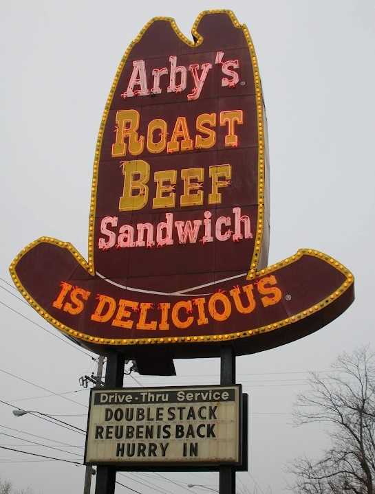 Arby’s Roast Beef was established in 1964. There are few stores remaining with their original early 1960s “big hat” neon signs like this one in Mansfield.